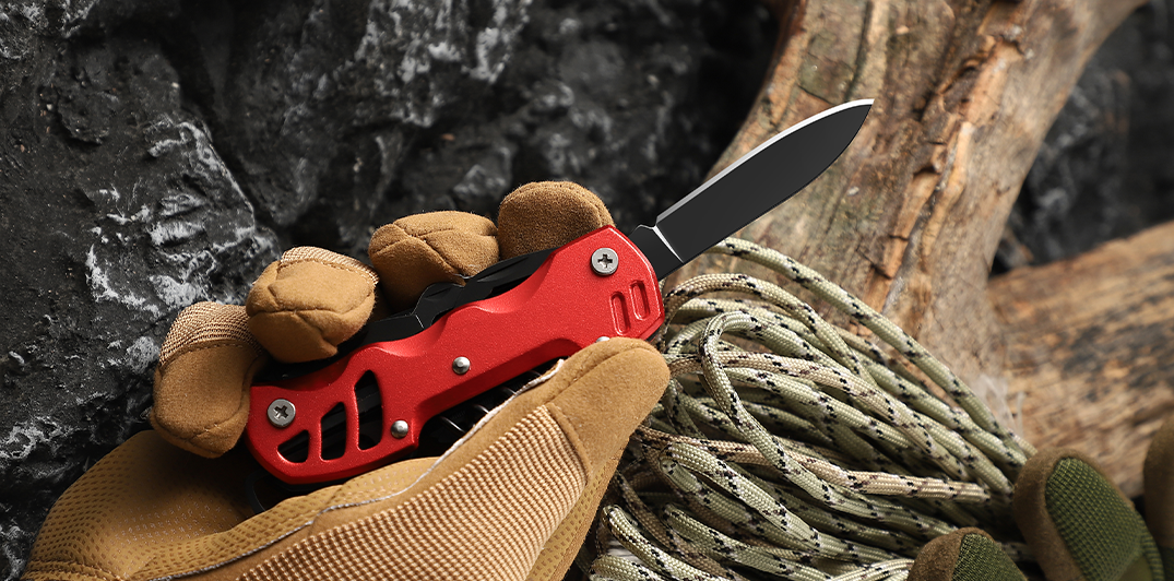 Complementing it is the 16-in-1 Swiss-Style Multitool, featuring a vibrant red aluminum handle and essential functions including a precision scissor, serrated wood saw, fish scaler, wine opener, and hook releaser.
