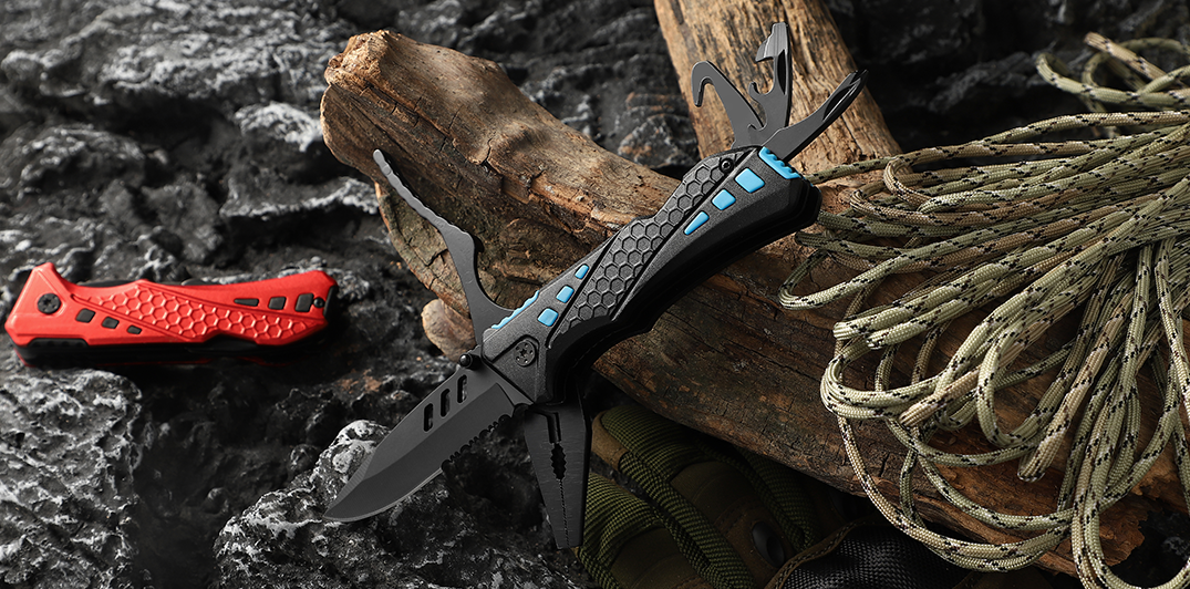 Tactical Blade Design: The primary blade features a sleek black finish with tactical cutouts and a serrated edge for cutting through tough materials like rope or branches.