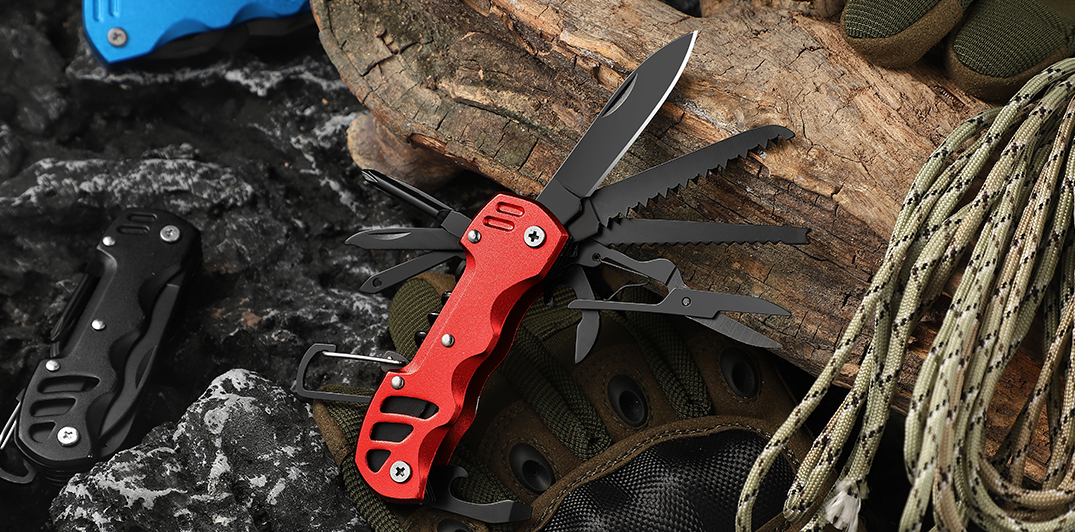 Complementing it is the 16-in-1 Swiss-Style Multitool, featuring a vibrant red aluminum handle and essential functions including a precision scissor, serrated wood saw, fish scaler, wine opener, and hook releaser.