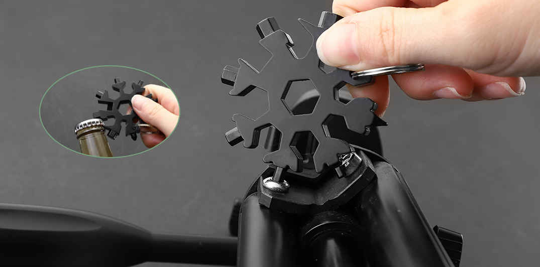 Complementing it is the ultra-portable 18-in-1 Snowflake Tool, which integrates internal and outer hex wrenches (3mm-14mm), a bottle opener, and screwdrivers into one innovative design.