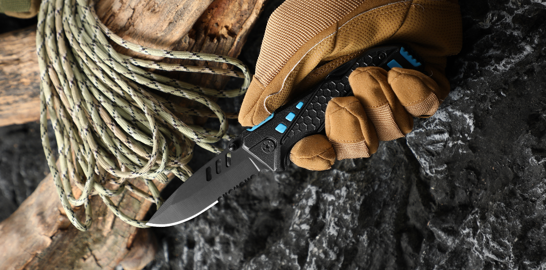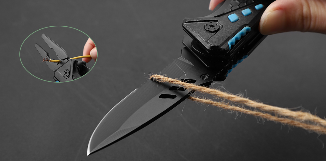 Tactical Blade Design: The primary blade features a sleek black finish with tactical cutouts and a serrated edge for cutting through tough materials like rope or branches.