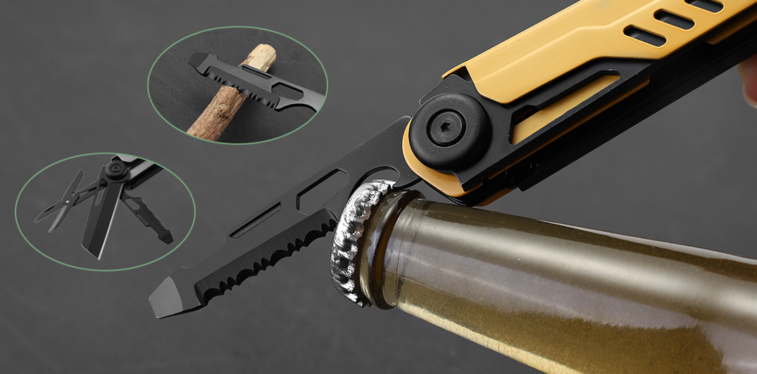Precision Tool Set: Includes heavy-duty Scissors, a Saw, an Outer Hex Wrench (5mm/5.5mm/6mm), a bottle opener, and both Phillips and Slotted screwdrivers.